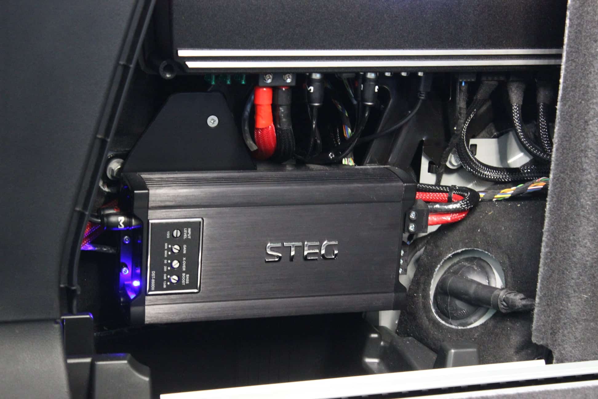 The powerful ARC Audio 1000.6 DSP power amplifier (6×175 watts RMS), together with an additional monoblock from STEG DST850D-II, provided an unprecedented dose of energy in this class of car while maintaining complete control.