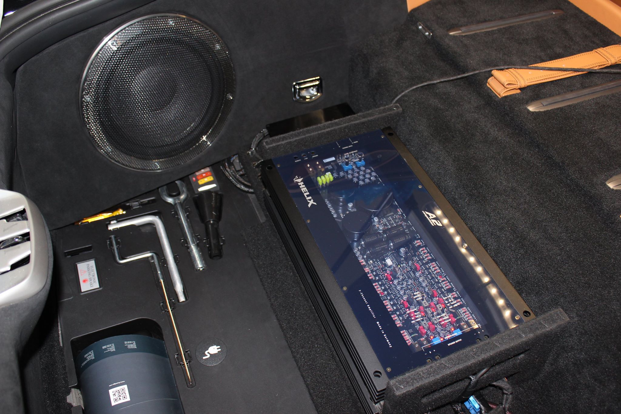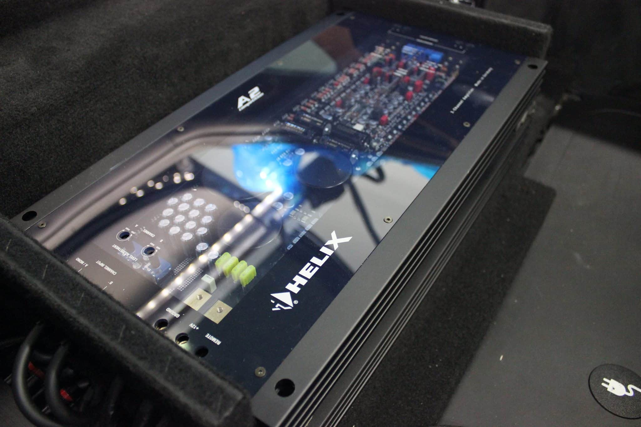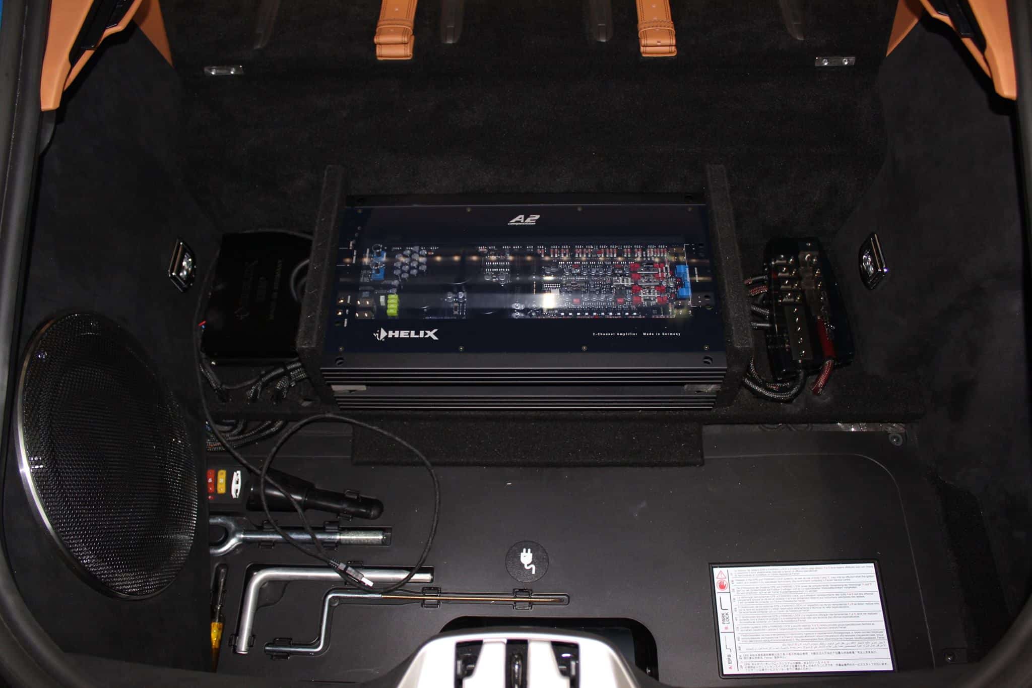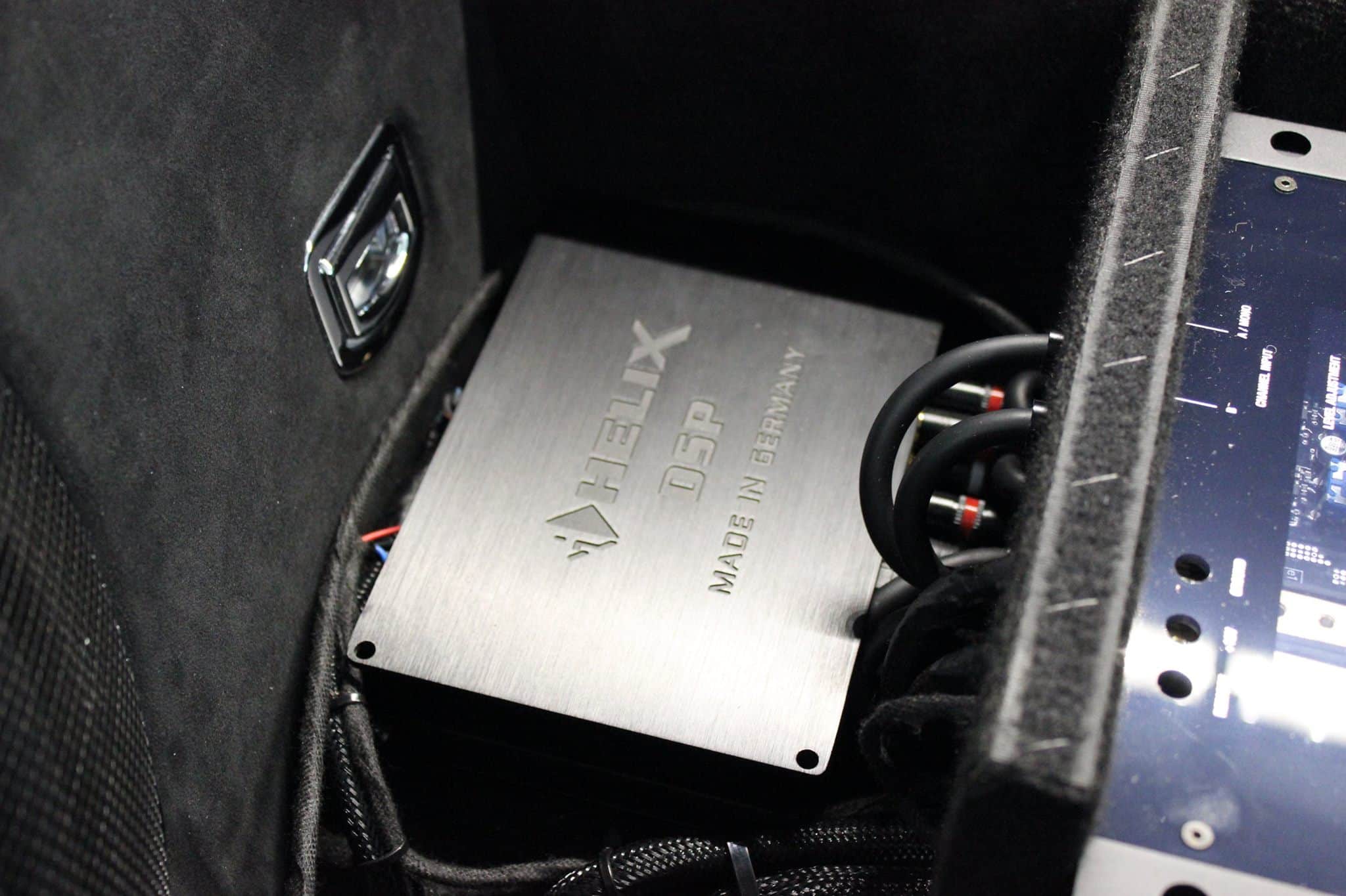 Tutaj trafił High-Endowy subwoofer Brax Matrix, zawodnicze wzmacniacze Helix-a oraz procesor dźwiękuDSP – mózg całej operacji.